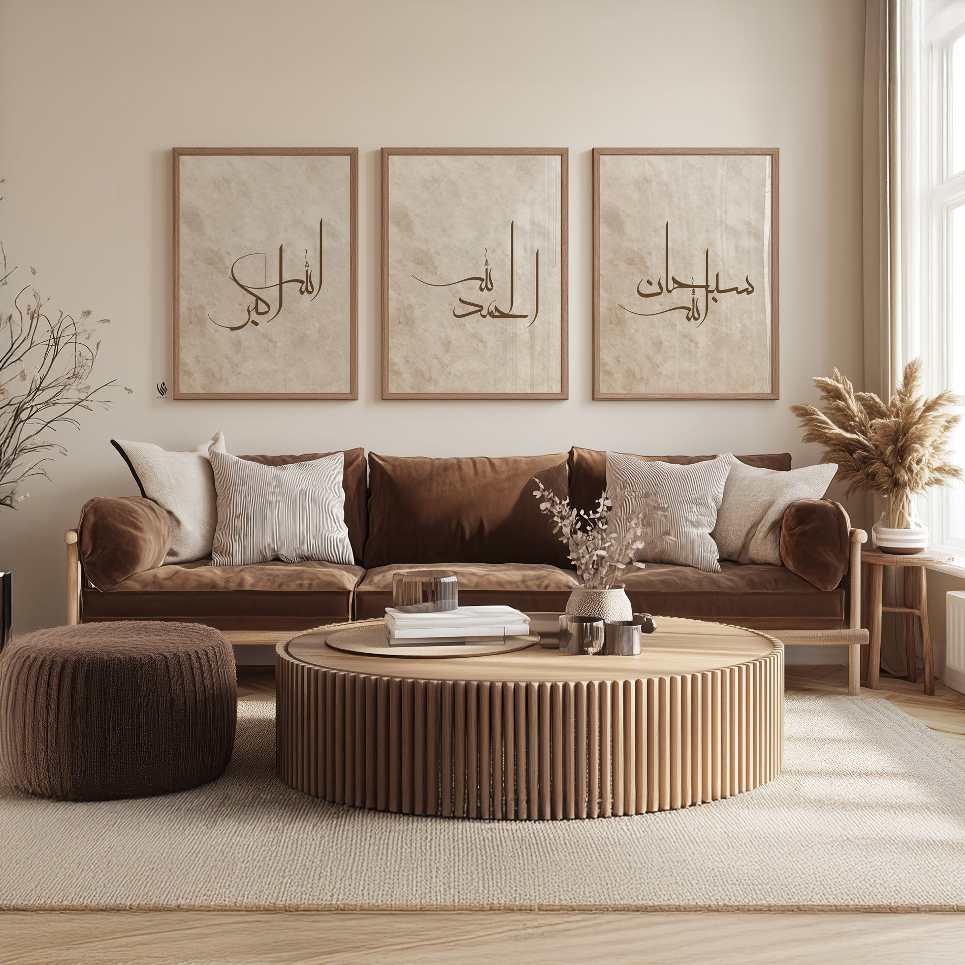 Set of 3 Islamic Wall Art Prints Beige & Brown, Subhanallah Alhamdulillah Allahuakbar D54