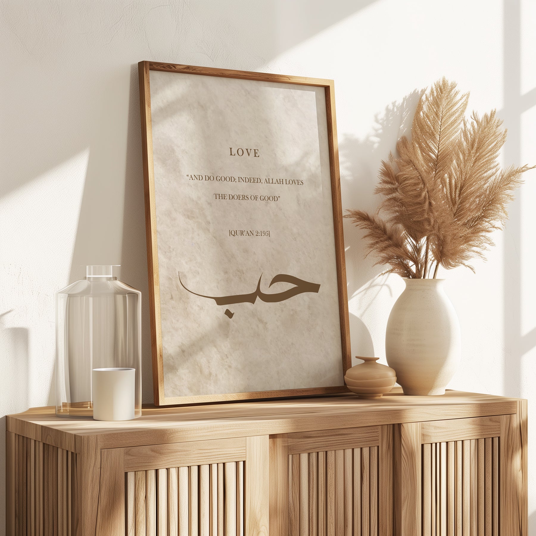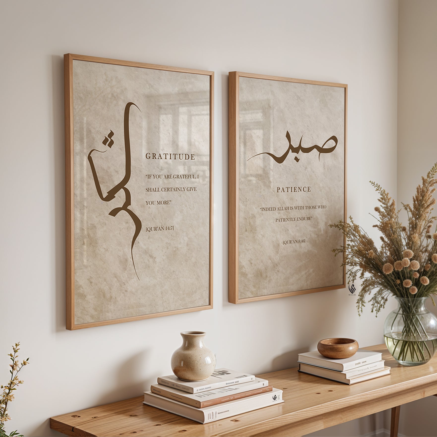 Set of 3 Islamic Wall Art Prints, Beige and Brown Sabr Shukr Hubb D58