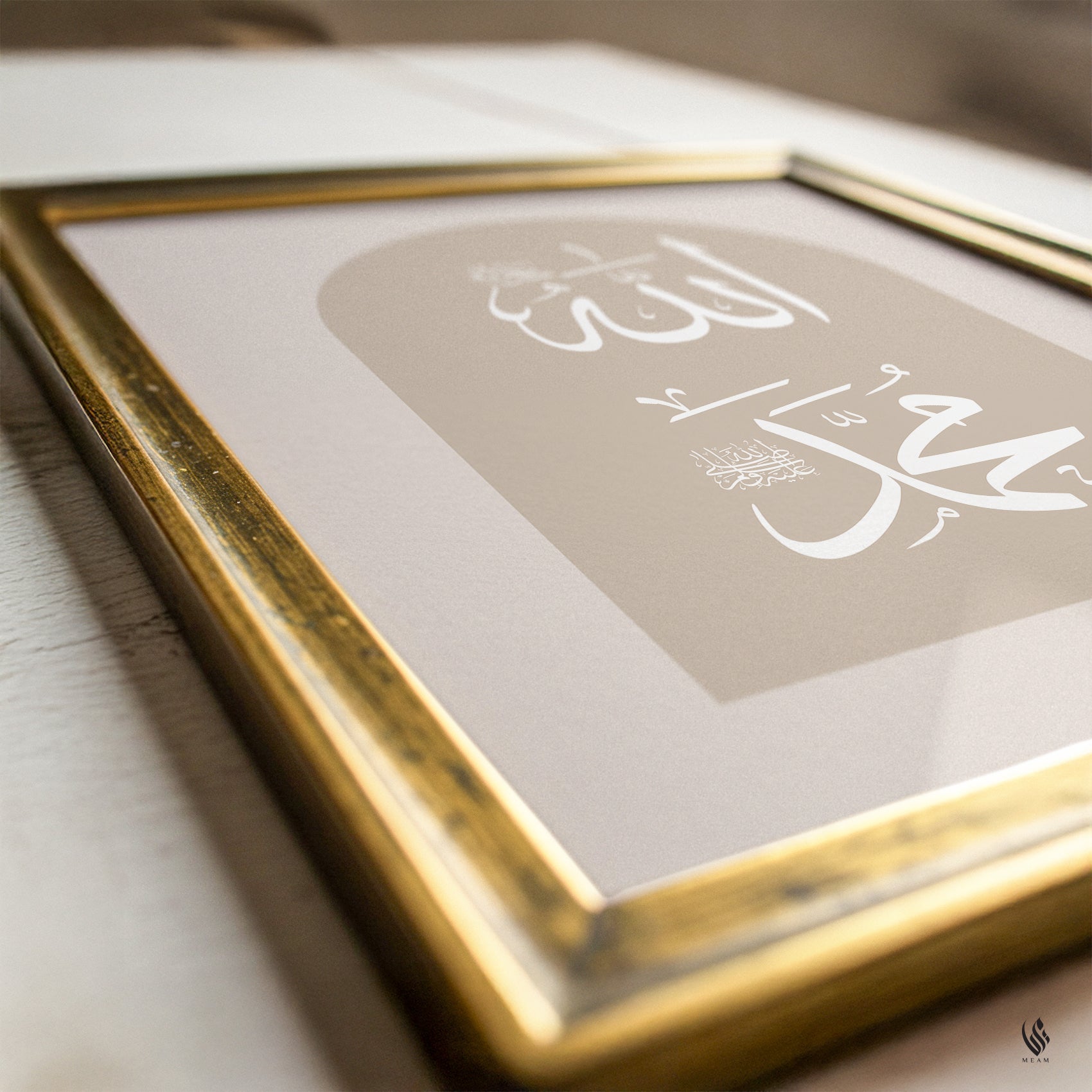Featuring Allah, Muhammad, Hayya al asalah & Hayya al alfalah in Arabic calligraphy.